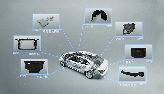 非金属产品包括前端框架、车底护板、备胎仓、门基板、轮罩、电池包上壳体等