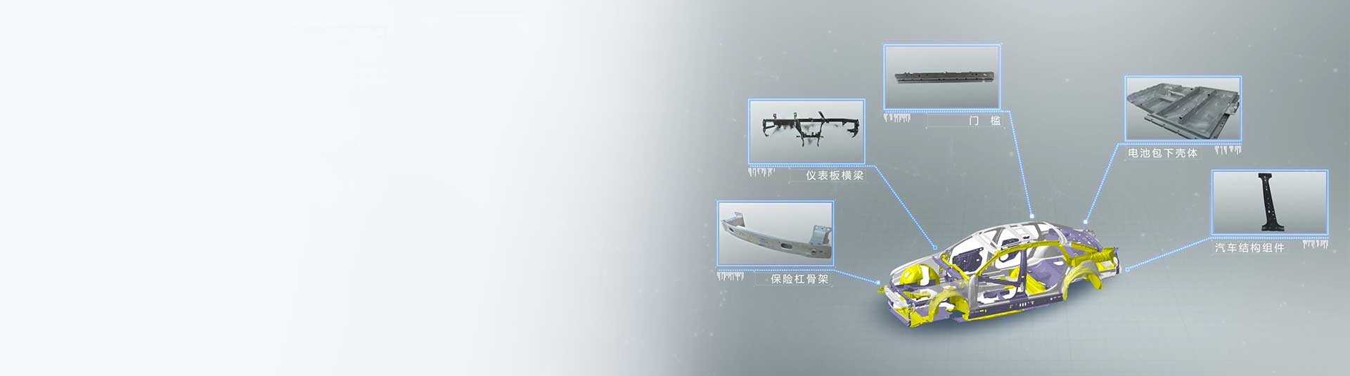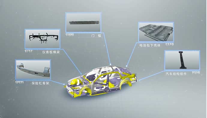 金属产品包括车身结构件及安全件,如仪表板横梁、保险杠骨架、门槛、电池包上下壳体 、副车架总成、热成型A柱总成等